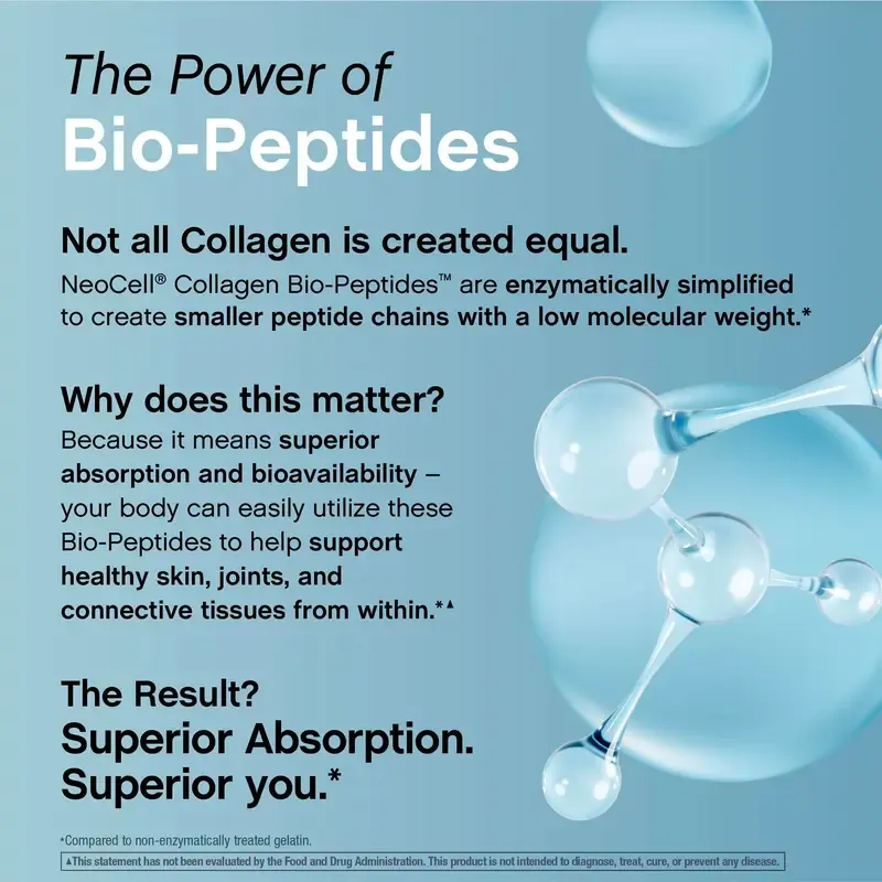 NeoCell Collagen Bio-Peptides are enzymatically simplified to create smaller peptide chains with a low molecular weight. * Why does this matter? Because it means superior absorption and bioavailability, your body can easily utilize these Bio-Peptides to help support healthy skin, joints, and connective tissues from within. *▲